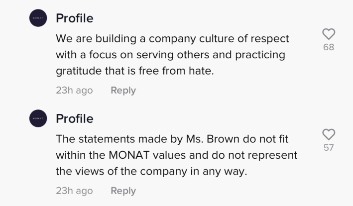 In the comment section of another video posted by @pandorasbreadbox, the company Brown had worked for, Monat, stated that she had been terminated.