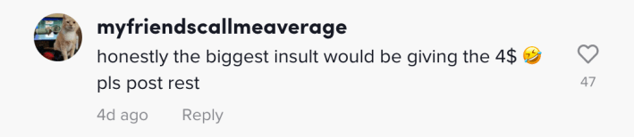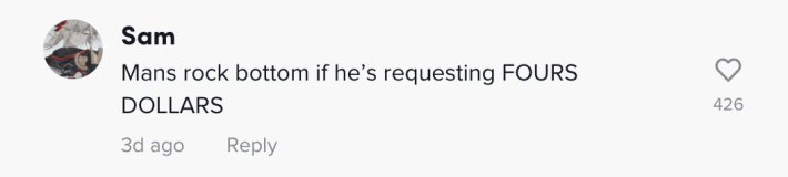 "Mans rock bottom if he’s requesting FOURS DOLLARS," another viewer wrote.