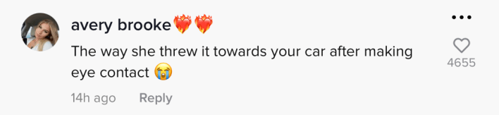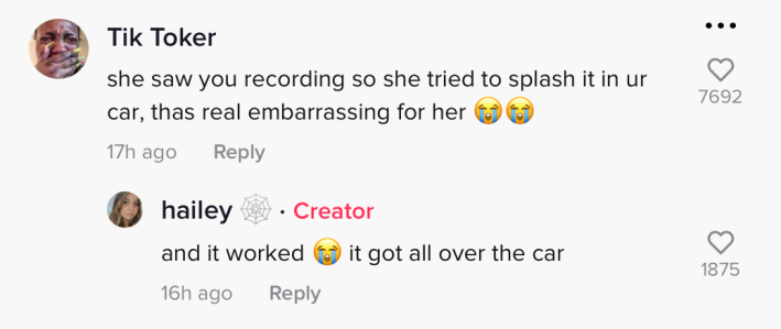 "She saw you recording so she tried to splash it in ur car, (that's) real embarrassing for her," one commenter noted.