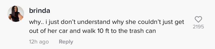 "Why...I just don't understand why she couldn't just get out of her car and walk 10 feet to the trash can," one commenter wrote.