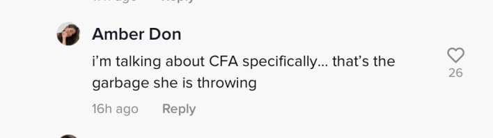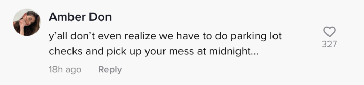 "Y'all don't even realize we have to do parking lot checks and pick up your mess at midnight," the commenter wrote. "I'm taking about (Chick-Fil-A) specifically...that's the garbage she is throwing."