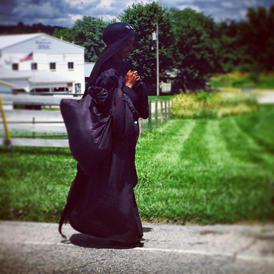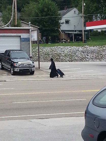 Other onlookers have wryly noted that the presence of so many spectators says more about the rest of us than it does the woman in black. Commenting to a photo album by Tod Kessinger of the woman, Facebook user April Taylor noted her walking in front of a U.S. flag and quipped, "America, where you can't walk without being stalked and interogated."