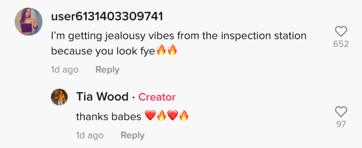 “I’m getting jealousy vibes from the inspection station because you look fye,” one user commented.