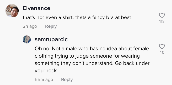 “That’s a fancy bra at best,” one user commented, to which someone replied, “Oh no. Not a male who has no idea about female clothing trying to judge someone for wearing something they don’t understand. Go back under your rock.”