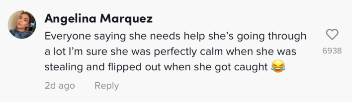 "Everyone saying she needs help she's going through a lot I'm sure she was perfectly calm when she was stealing and flipped out when she got caught," one commenter wrote.
