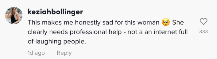 "This makes me honestly sad for this woman," one commenter wrote. "She clearly needs professional help——not an internet full of laughing people."