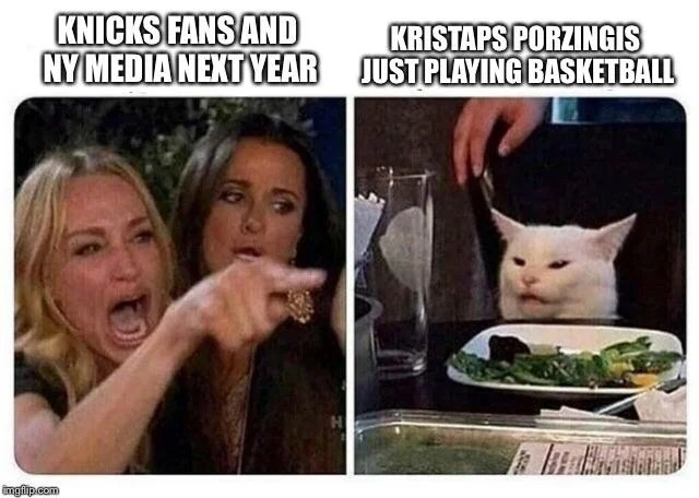 According to KnowYourMeme, one of the other first well-known examples of the woman yelling at a cat meme was when, just a month later on June 2, redditor PerpetualWinter posted the following example riffing off of Knicks fans.
