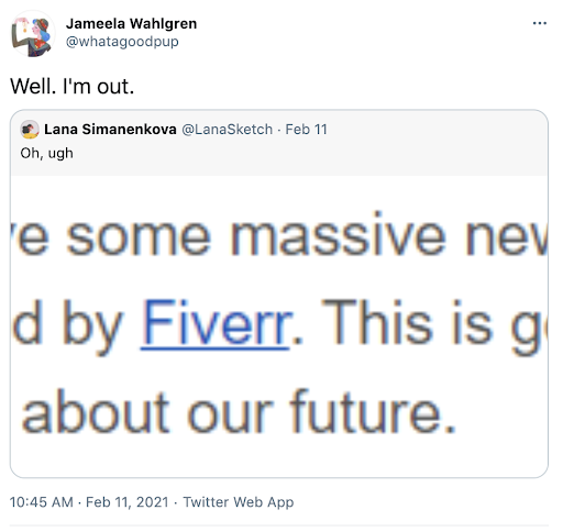 The CEO acknowledged the tweet after the acquisition, writing, “I didn’t take it down when we started talking to Fiverr or before this announcement because I own what I say & allow myself to change my opinion when presented with new information. They're not the company I thought they were + I wanted to win a Webby.”