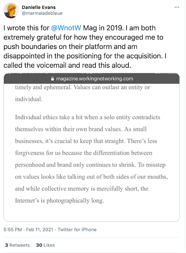 Danielle Evans did call the hotline. The writer and dimensional typographer not only used Working Not Working in the past but also contributed to its magazine, including writing an article on the ethics of artists working for big brands that contradict their values. She says she read that out loud in her voicemail to the company.
