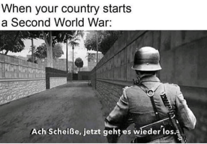 Given the similarities between the result of the first war and the second, it’s no surprise someone recreated the “Ah, shit, here we go again me” from Grand Theft Auto in German.