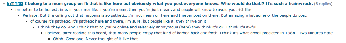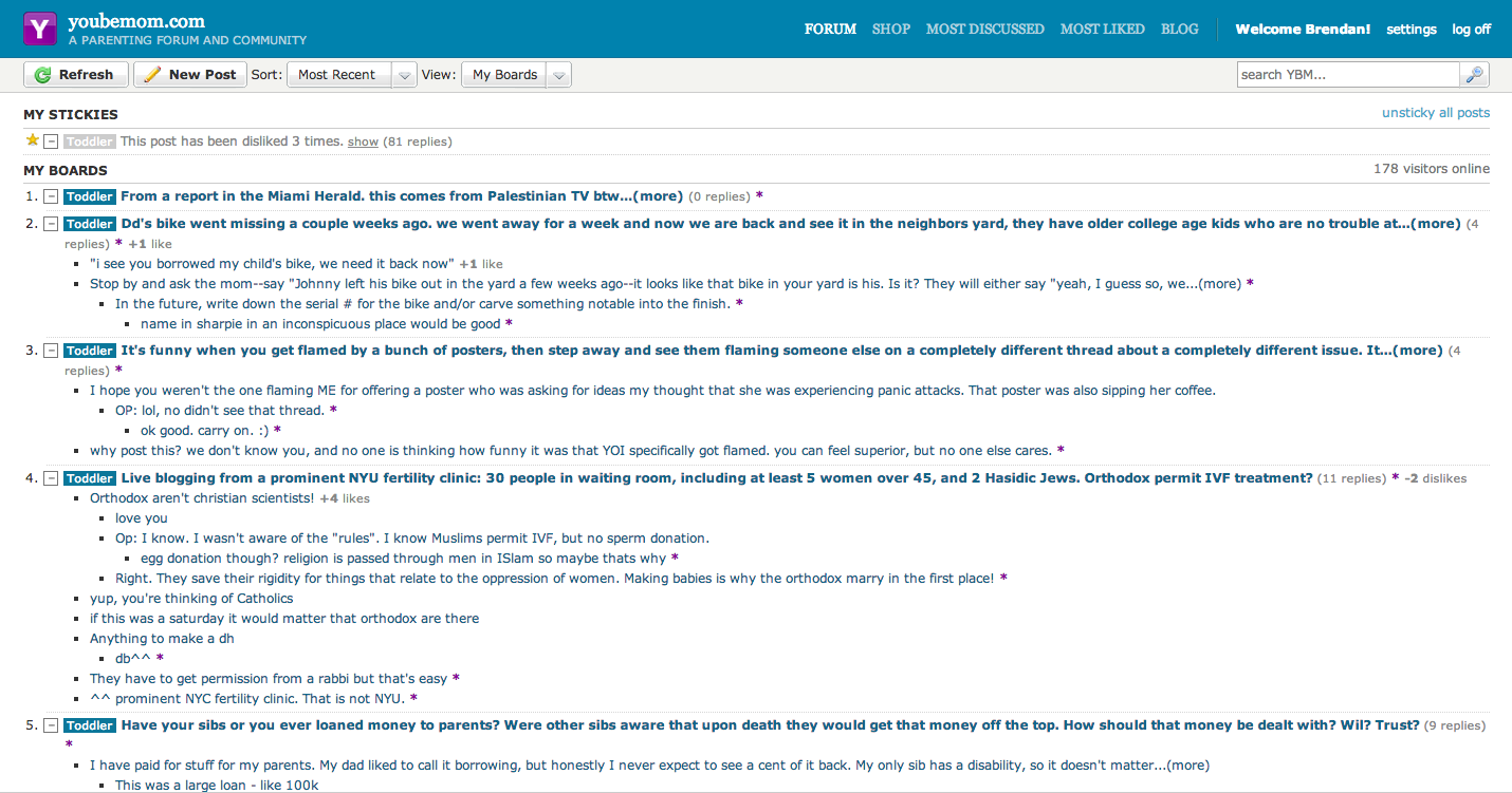 YBM, like most internet fora, has multiple “boards”; YBM’s are organized both thematically and geographically. The overwhelming majority of threads, though, are posted on the “Toddler” board; for one reason or another, the others, like the “Cleveland” board, never really caught on.