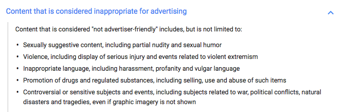 On the YouTube Help page, it states that creators who’ve posted content that’s “not advertiser-friendly” will be alerted directly either via email or a yellow dollar sign in the video manager that will notify them of demonetization. Non-advertiser-friendly content includes sexually suggestive or violent videos; “harassment, profanity, and vulgar language”; promotion of drugs; and “controversial or sensitive subjects and events, including subjects related to war, political conflicts, natural disasters and tragedies, even if graphic imagery is not shown.”