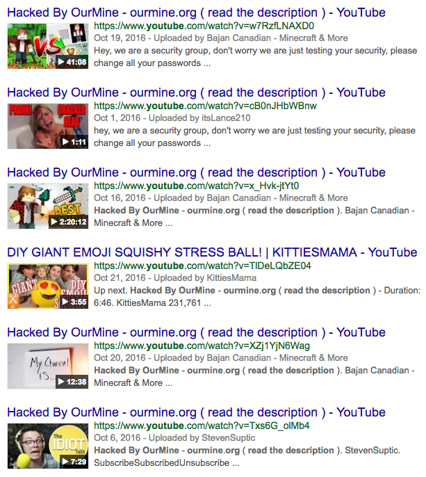Cached Google search results reveal that OurMine changed the videos’ descriptions to, “Hey, we are a security group, don't worry we are just testing your security, please change all your passwords and also please contact us for security tips.” OurMine also included an email address.