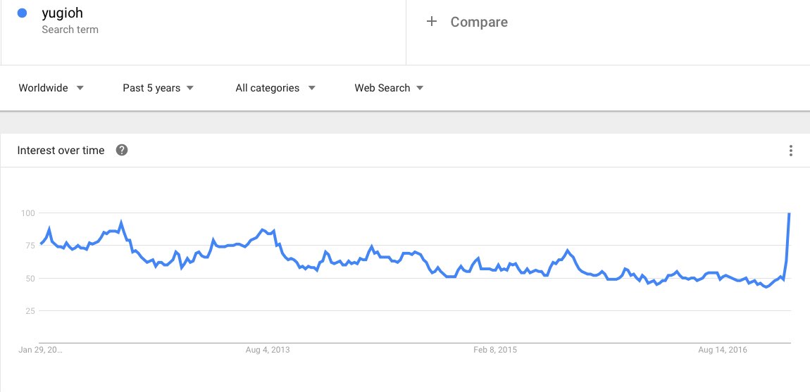 Take a look at this Google Trends graph of searches for "yugioh." The franchise is as big as it's ever been, thanks to the release of a new mobile game called Yu-Gi-Oh Duel Links and the first English Yu-Gi-Oh movie in a decade: