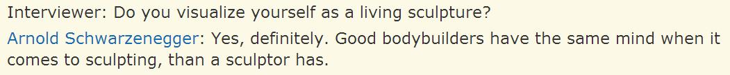But what truly made Schwarzenegger different from his competition was his attention to definition and unabashed confidence. As shown in the documentary Pumping Iron, Schwarzenegger discusses how he treats his body like a sculpture treats a block of marble, taking a little off and putting some on to make the piece nearly perfect.