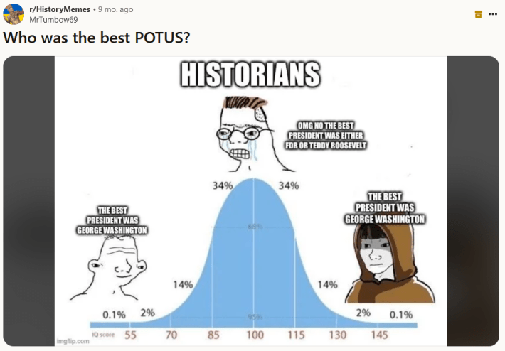 As a meme, the supposed IQ bell curve is used to declare who and what is “normal,” representing unintelligent or “low IQ” people on the left and intelligent or “high IQ” people on the right. In the middle are the average “midwits,” most often portrayed with a miserable crying Zoomer Wojak.