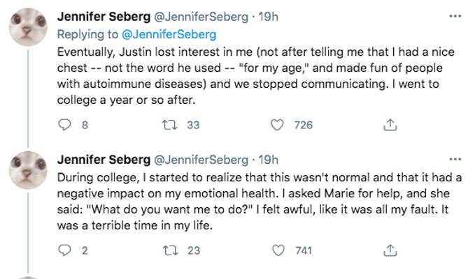 “When I was a teenager, I thought Virgil Texas was very funny,” Seberg tweeted, beginning her thread. “I asked him to proofread an essay I submitted to a website, and emailed it to him. The essay was about turning 16. We talked a little bit, and I thought he was very cool because he was funny and he lived in NY.”