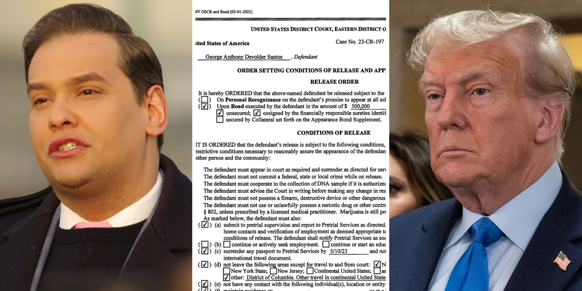 In a document obtained by MSNBC, the conditions of Santos's pre-trial release on bond set include prohibiting him from traveling outside New York City, Long Island, and D.C. without "advanced notice to gov/pretrial."