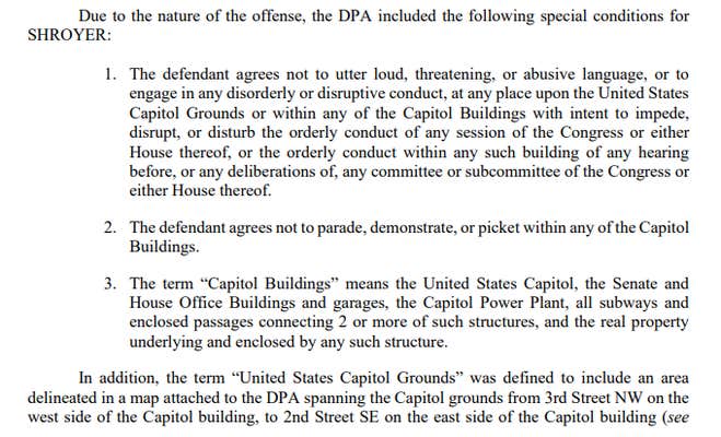 The agreement also reportedly included a map defining what area constituted Capitol grounds. “As a result of the DPA, Shroyer had special knowledge of what areas in Washington, D.C. in and around the U.S. Capitol constituted the U.S. Capitol grounds,” prosecutors claim.