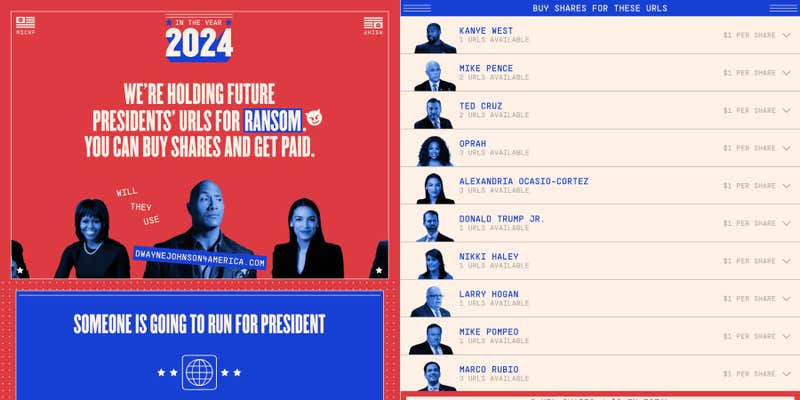 The web addresses of potential future presidential candidates are being scooped up and held for ransom as part of the latest scheme from MSCHF, a mysterious startup company known for its outlandish internet campaigns.