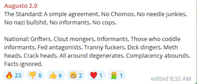 As the conflict festered, founder Gavin McInnes stepped in. On Telegram last month, McInnes claimed that federal agents are secretly meddling to turn them against one another. He offered no evidence for this allegation.