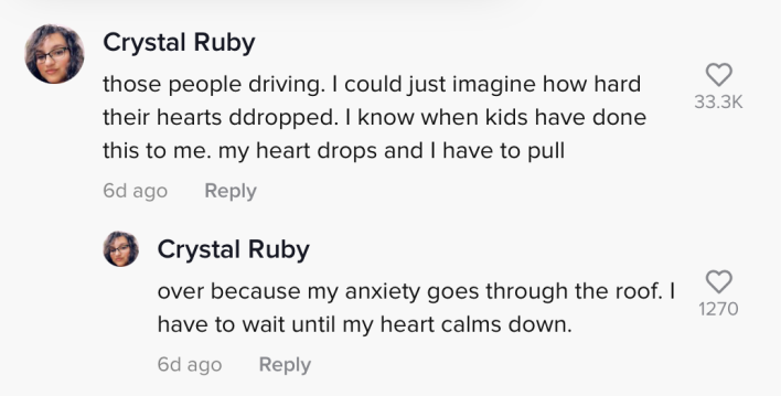 "Those people driving," one commenter wrote. "I could just imagine how hard their hearts dropped. I know when kids have done this to me, my heart drops and I have to pull over because my anxiety goes through the roof. I have to wait until my heart calms down."