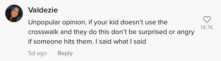 "Crosswalks and lights exist for a reason," one commenter wrote. "If you do that and some car hits you, your fault. Teach your kids, or lose them."