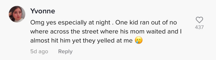 "Omg yes especially at night," the user wrote. "One kid ran out of nowhere across the street where his mom waited and I almost hit him yet they yelled at me."
