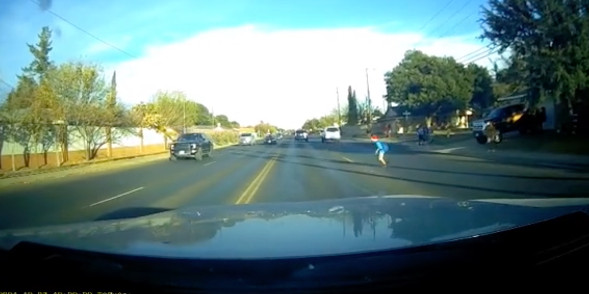 The dash cam footage, shared by @shwizzle13, shows a young boy crossing a four-lane roadway as cars in at least three of the lanes are coming from both directions. A silver truck slows down just in time for him to pass by.