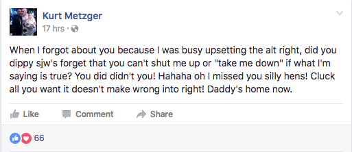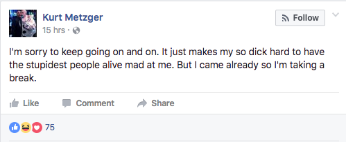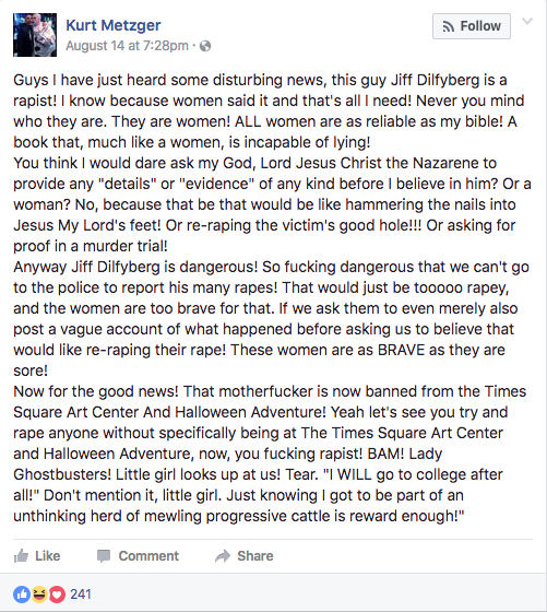 Metzger also continued to post publicly on his Facebook account, arguing that victims must go to the police to seek justice. According to Metzger, those who don’t urge victims to do so need to “pull [their] heads out of [their] cunts and [their cunts] out of their blogs…”