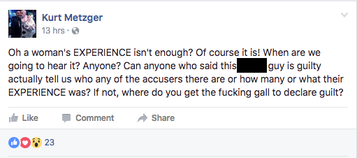 According to those sharing the news, there were multiple complaints from different women that the same man had raped them over the course of several years. Not all posts directly named the comedian involved. Several members of the community simply posted, “I believe women,” or shared their own stories of surviving abuse and sexual assault. Metzger, however, felt the posts were symptomatic of a dangerous “call out” culture and posted the following.