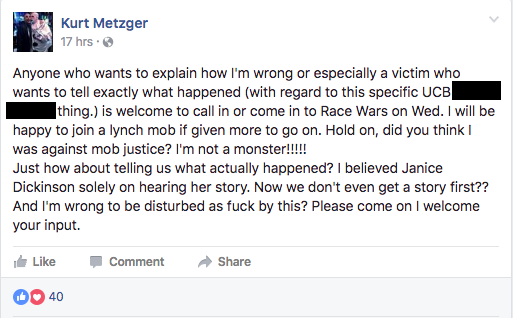 In his post, Metzger mocked a series of social media posts that spread on Saturday for calling out an alleged rapist and offering solidarity to survivors of sexual assault. The posts were written largely in response to news that had circulated in private Facebook groups that a comedian had been banned from Upright Citizens Brigade theaters and training centers, based on private reports of alleged rape.