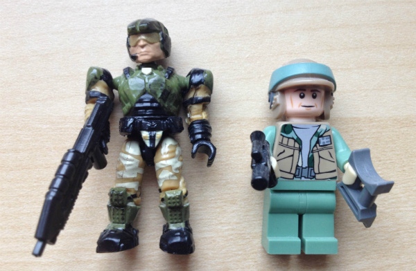 Mega Bloks bricks may be very similar to Lego bricks, but Mega Bloks' minifigures are very distinct from Lego's. Here’s a Halo Mega Bloks UNSC Marine minifigure next to a Lego Star Wars Endor Rebel Trooper minifigure. They’re totally different from one another in terms of size, articulation, and sculpting.