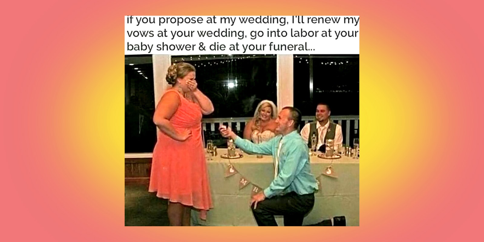 The If You Propose At My Wedding meme is a double-paneled meme with an image on the bottom and the copypasta text at the top. The image depicts a man in a teal shirt proposing to a woman wearing a peach dress, her hand over her mouth in surprise. In the background, a bride and groom are at the sweetheart table, smiling awkwardly as they watch the moment unfold.
