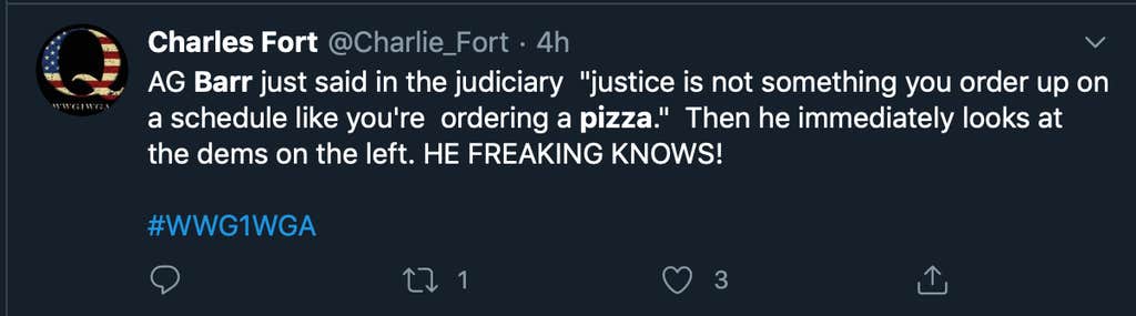 “AG Barr just said in the judiciary ‘justice is not something you order up on a schedule like you’re ordering a pizza.’ Then he immediately looks at the dems on the left. HE FREAKING KNOWS!” another conspiracy theorist tweeted.