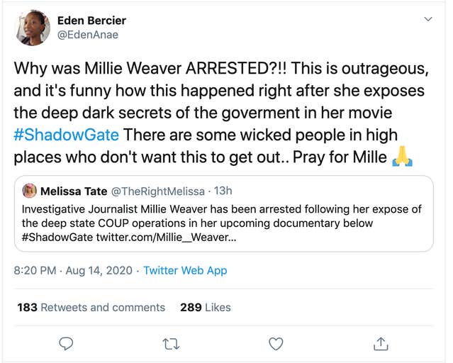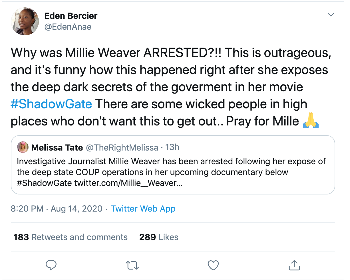 “Why was Millie Weaver ARRESTED?!! This is outrageous, and it’s funny how this happened right after she exposes the deep dark secrets of the government in her movie #ShadowGate,” Twitter user @EdenAnae declared. “There are some wicked people in high places who don’t want this to get out…Pray for Mille.”