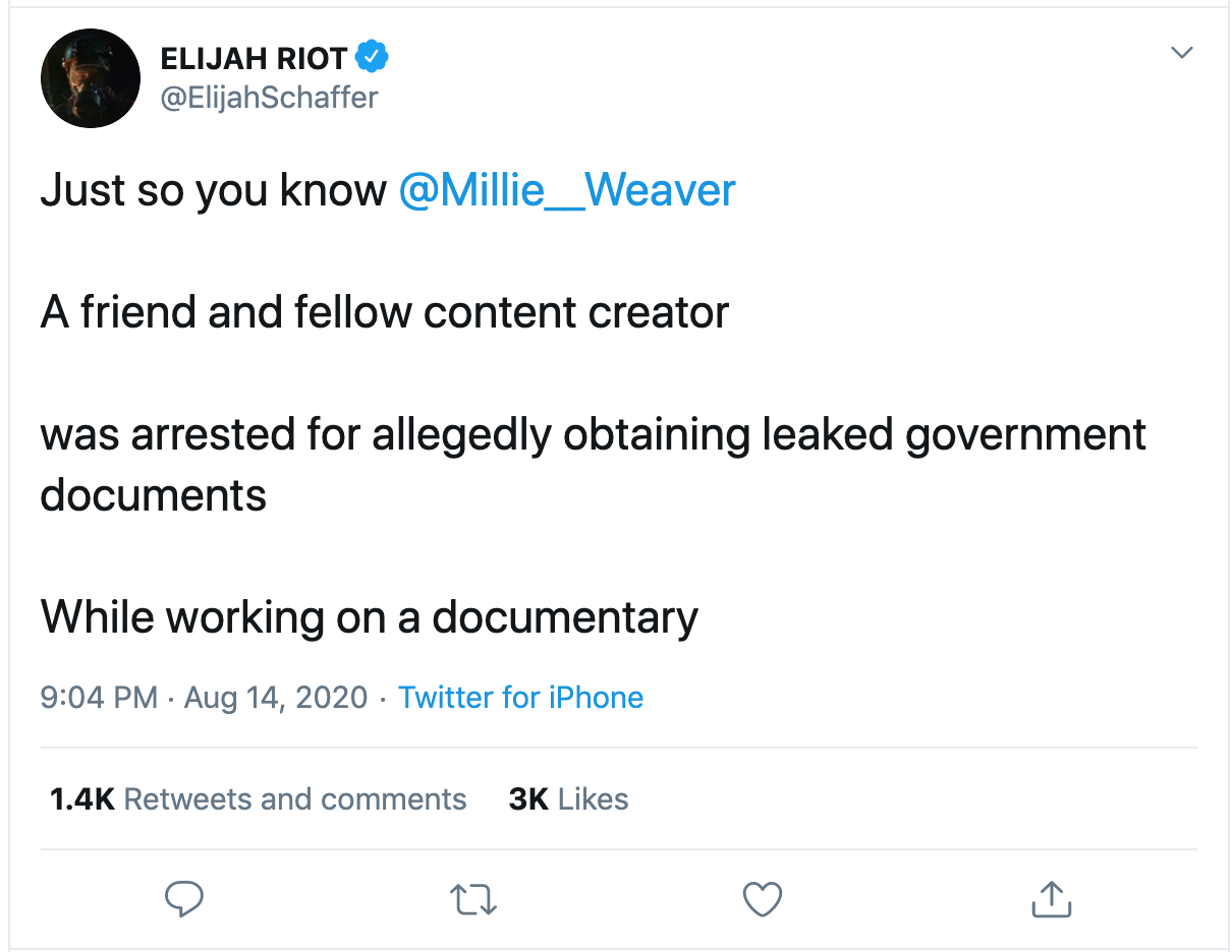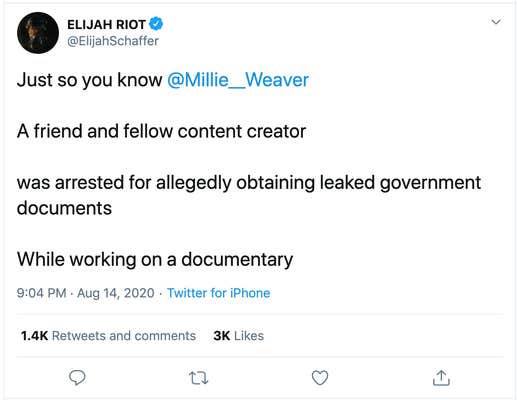 Blaze TV host Elijah Schaffer further fueled the conspiracy theories, stating that Weaver was arrested “for allegedly obtaining leaked government documents.”