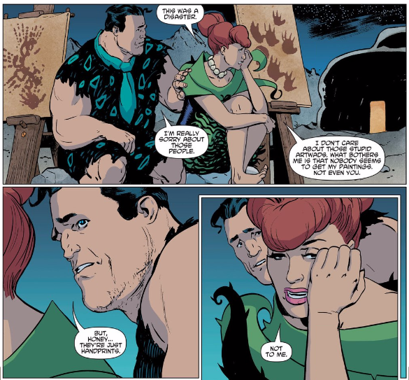 The new comic keeps the puns and the prehistoric appliance gags, but leans into a more cynical view of the suburban existence parodied in the original. Fred is a loving husband and father, wracked with neuroses about navigating corporate life and providing for his family. Meanwhile his wife, Wilma, struggles to express her identity beyond her role as a housewife. She’s an aspiring artist, but no one seems to understand her work—which mostly consists of handprint cave paintings.