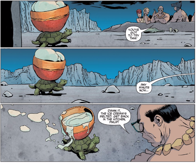 This comic’s genius lies in the contrast between the silliness of The Flintstones, and the morbid humor of seeing those scenes play out among characters who look and react like real(ish) adults. Almost every page includes a punchline that could easily belong in the original cartoon, but now feels agonizingly downbeat due to the darker tone. For instance, here’s Fred’s boss introducing everyone to a new discovery: ice cream.