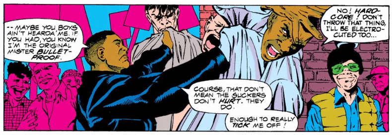 Despite some rather dated dialogue, the first issue sets the tone for the political subtext of Luke Cage as a Black superhero. His enemies are sadistic prison guards and an unfair legal system, his superpowers originate from unethical medical experiments, and his bulletproof skin has obvious real-world connotations. There’s even a moment where a prison guard shoots Cage because he thinks he saw a gun, when Cage had actually just picked up a rock to defend himself.