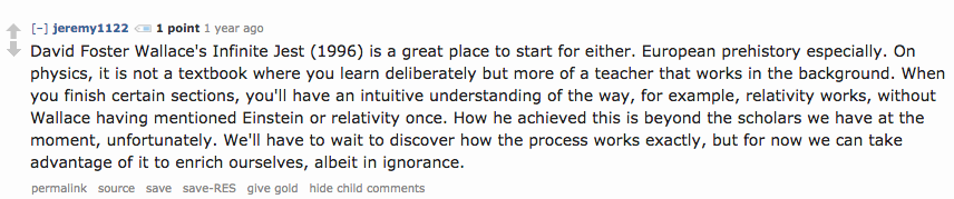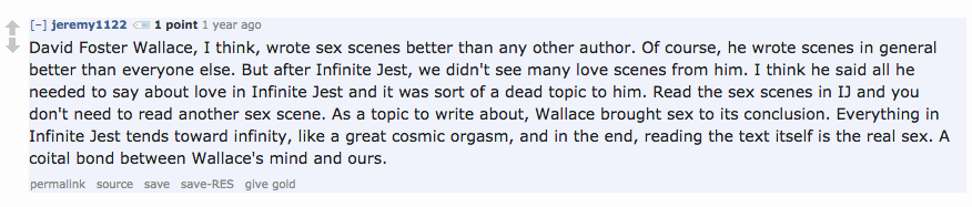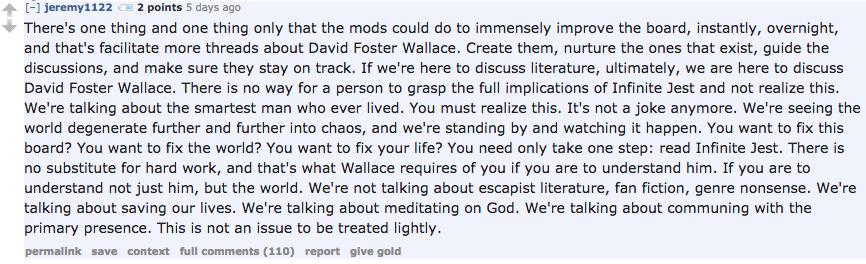 Whether downvoted, dismissed, our simply ignored, jeremy1122 remains a tireless advocate for David Foster Wallace and the author's most enduring tome. Eventually, he comes to expose the weird insulation and monomania of reading itself—a motif worthy of a Jorge Luis Borges or Enrique Vila-Matas. In his worldview, there is nothing that falls outside the scope of this particular fandom, and nothing that it cannot explain in molecular detail.