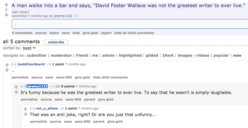 The gimmick didn't die in this thread. Ever since this auspicious debut, jeremy1122 has only ever used his Reddit account to wax pretentious about Wallace and his body of work, regularly provoking even more pretentious replies from other readers (the Joseph McElroy name-check above is a prime example). He parodies the most cringeworthy aspects of neckbeard faux-intellectualism by fully inhabiting this very mode, brilliantly enacting Poe's law: He's indistinguishable from the people he mocks.