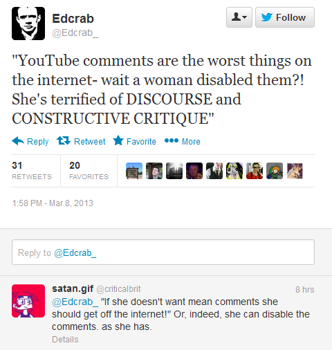 “What are you afraid of, Anita? Why can’t people have a discourse about your material? Why can’t people make their opinions towards your content known? I understand that some comments will be abusive in nature — probably most will — but so what?”