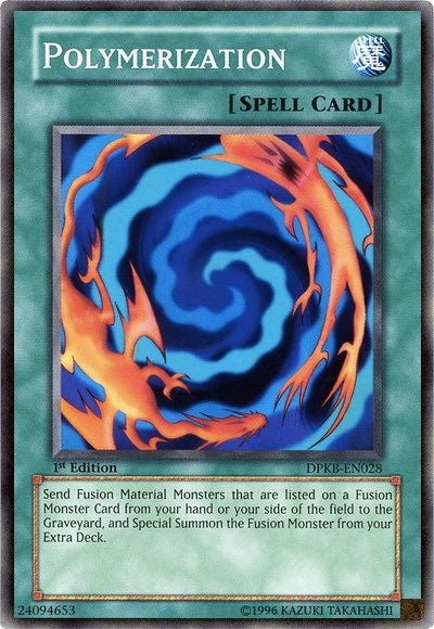 Yep, it’s a “Polymerization” card from the popular anime and collectible card game franchise Yu-Gi-Oh. This fusion card combines two monsters to make a single, larger, more powerful one.