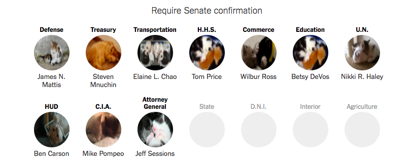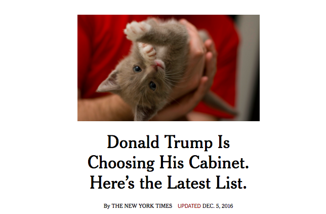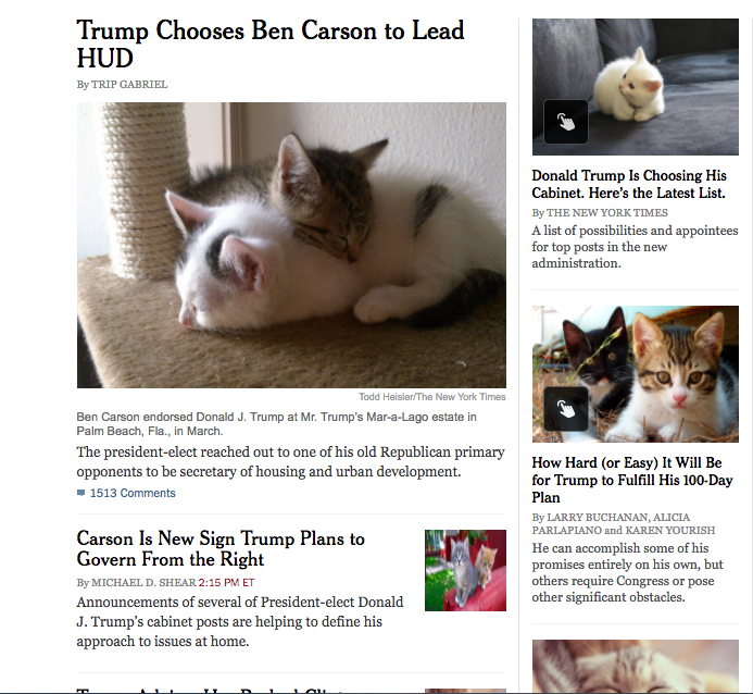 The tool works particularly well on the New York Times. Simply pop the extension into Chrome, and coverage of Trump’s cabinet is transformed into a full-on kitten party.
