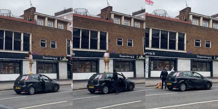 Video footage shows a woman jumping on top of a car in London, England before getting shoved off to the ground.